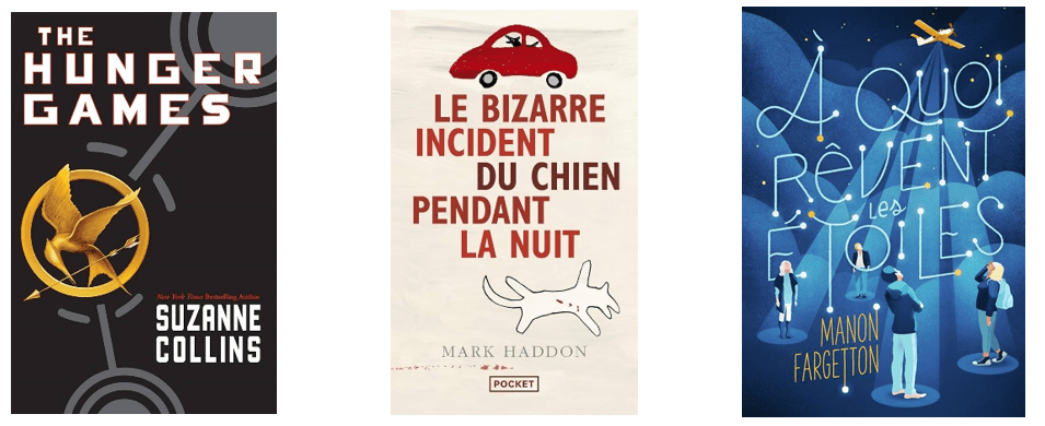 Ce filtrat peut être d’une extrême simplicité (exemple : Hunger Games, de Suzanne Collins – deux mots, le concept clé de la saga, et voilà !) ou plus long (exemple : Le Bizarre Incident du chien pendant la nuit, de Mark Haddon – ça correspond totalement à l’esprit du livre et à son narrateur), ou plus poétique (exemple : A quoi rêvent les étoiles, de Manon Fargetton – tout à fait adapté à la très belle plume de cette autrice et au thème de constellation du roman).